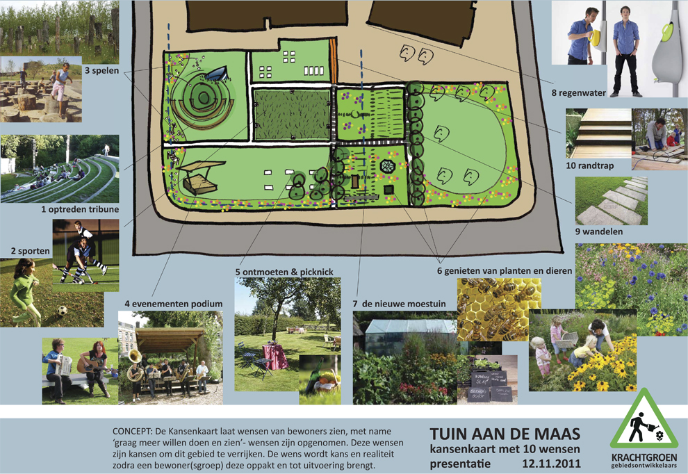 In Rotterdam toverden buurtbewoners van het Lloydkwartier een ‘witte vlek’ op de Rotterdamse Mullerpier om tot een buurttuin, de “Tuin aan de Maas“. In 2012 hebben wij in opdracht van de Koninklijke Nederlandsche Heidemaatschappij de bewoners rondom de “Tuin aan de Maas” begeleid bij het inventariseren van de wensen voor de uitbreiding van de tuin en het ontwerp. Na een gezellige dag vol workshops werden er veel wensen verzameld en behoeften gepeild. Het resultaat was een verrassende prioriteitenlijst voor de toekomst van “Tuin aan de Maas”. Hieronder een indruk van dit inspirerende proces.